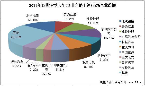 2016年12月份,國(guó)內(nèi)輕型卡車(chē)(含非完整車(chē)輛)銷(xiāo)售161633輛,同比增長(zhǎng)11.53%。銷(xiāo)量前十企業(yè)7家增長(zhǎng)3家下滑。具體排名如下: